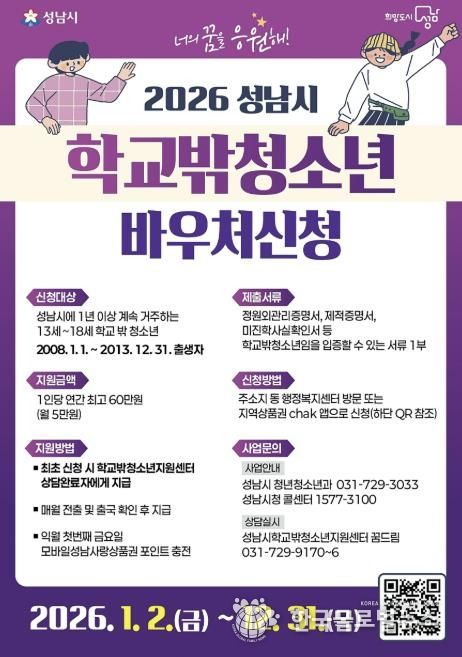 성남시 관계자는 “학교 밖 청소년 바우처 사업은 단순한 금전 지원이 아닌 청소년이 자신의 삶을 주도적으로 설계할 수 있도록 돕는 성장 지원 정책이자 성남시 적극 행정의 하나”라면서 “은둔·고립 위기 청소년 발굴과 사회 복귀 지원책을 지속해 나갈 것”이라고 말했다.