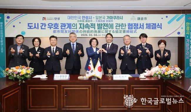 (한국글로벌뉴스 - 박소연 기자) 안성시는 2026년 3월 4일 오전 11시 안성시청 본관 2층 상황실에서 일본 가나가와현 가마쿠라시(시장 마쓰오 다카시)와 '도시 간 우호 관계의 지속적 발전에 대한 협정'을 체결하고 양 도시 간 문화·예술 및 청소년 분야 교류를 본격 추진하기로 했다.