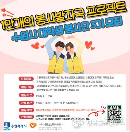 (한국글로벌뉴스 - 박소연 기자) 수원시청소년청년재단 수원시청년지원센터는 3월 3일부터 3월 13일까지 지역사회 봉사 문화를 확산하고 대학생들의 사회공헌 활동을 지원하기 위한 '1만 개의 봉사발자국' 참여 동아리를 모집한다.