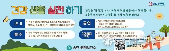 (한국글로벌뉴스 - 박소연 기자) 평택시 송탄보건소는 시민을 대상으로 걷기(신체 활동)·금연·절주·건강 체중 유지로 구성된 ‘4가지 건강생활습관 실천’ 수칙을 안내하며, 일상에서 작은 습관부터 실천해 건강을 지켜나갈 것을 당부했다.