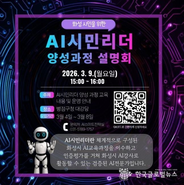 (한국글로벌뉴스 - 박소연 기자) 화성특례시는 시민이 학습하고 교육하는 인공지능(AI) 학습 체계 구축을 위해 ‘2026년 AI시민리더 양성 교육’ 설명회를 3월 9일 오후 3시에 병점구청 대강당에서 개최한다.