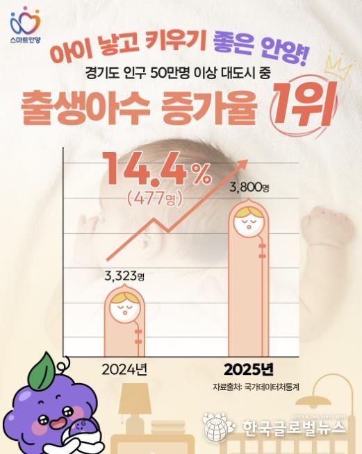 국가데이터처가 지난달 말 발표한 국가통계포털(KOSIS) 잠정 통계에 따르면, 2025년 안양시의 출생아 수는 총 3,800명으로, 2024년(3,323명) 대비 14.4%(477명) 급증하며 도내 인구 50만 이상의 지자체 중 가장 높은 상승폭을 기록했다.