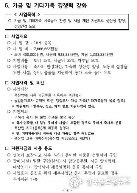 ‘가금 및 기타가축 사육농가 지원사업’은 시설 현대화를 통한 축사 환경 개선, 방역 물품 지원 등을 통한 생산성 향상이 주요 내용이다.