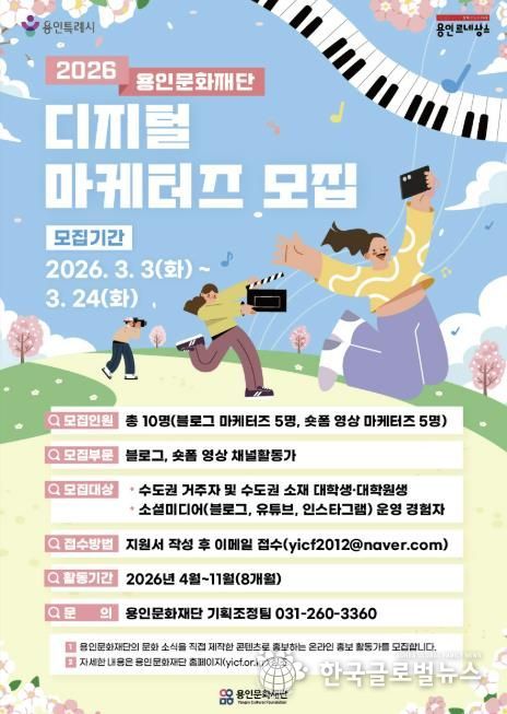 (한국글로벌뉴스 - 박소연 기자) 용인문화재단은 오는 3월 24일까지 재단의 다양한 문화·예술사업을 시민의 시선으로 홍보하기 위한 ‘2026 용인문화재단 디지털 마케터즈’를 모집한다고 밝혔다.