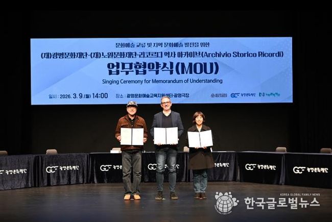 (한국글로벌뉴스 - 박소연 기자) (재)광명문화재단은 3월 9일 오후 2시 광명극장에서 (재)노원문화재단, 리코르디 역사 아카이브(Archivio Storico Ricordi)(이하 리코르디)와 ‘문화예술 교류 및 지역 문화예술 발전’을 위한 업무협약(MOU)을 체결했다고 밝혔다.