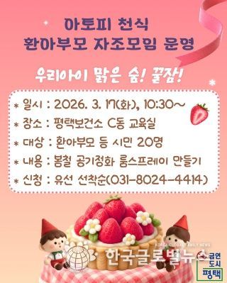 (한국글로벌뉴스 - 박소연 기자) 평택시는 알레르기 질환으로부터 안전한 지역사회 환경을 조성하기 위해 오는 17일 오전 10시 30분, 평택보건소(C동) 교육실에서 ‘아토피·천식 환아 부모 자조모임’을 운영한다고 밝혔다.