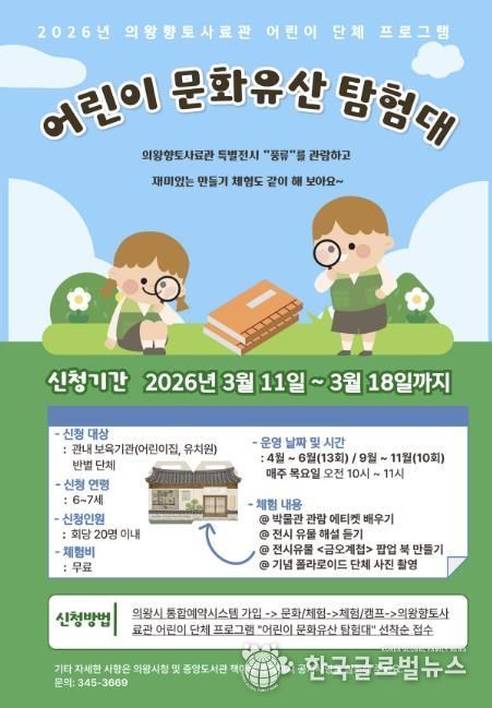 (한국글로벌뉴스 - 박소연 기자) 의왕시 향토사료관이 오는 4월부터 6월, 9월부터 10월 매주 목요일에 어린이 단체 체험프로그램 ‘어린이 문화유산 탐험대’를 운영한다.