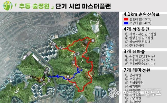 시는 총 57억5천만 원이 투입되는 단기 사업을 통해 현재까지 42.2헥타르(ha) 규모의 숲가꾸기와 8.8km 구간의 숲길 정비, 과학도서관 등 입구‧테마정원 조성을 완료했다.