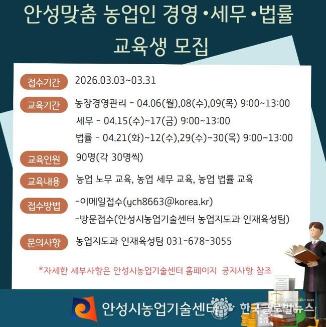 (한국글로벌뉴스 - 박소연 기자) 안성시농업기술센터가 지역 농업인의 안정적인 영농 활동을 돕기 위해 오는 31일까지 ‘안성맞춤 농업인 경영·세무·법률 교육’ 교육생을 모집한다.
