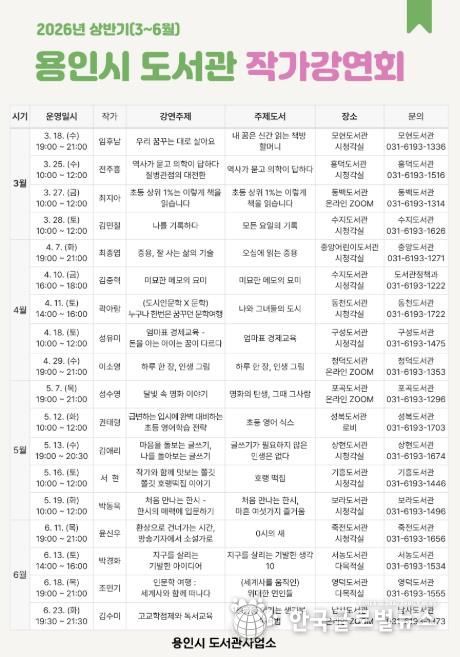 5월에는 7일 '명화의 탄생 그때 그 사람’의 저자 성수영 한국경제 기자(포곡도서관), 12일 '초등 영어 식스'의 저자 권태형 작가(성복도서관), 13일 '글쓰기가 필요하지 않은 인생은 없다'의 저자 김애리 작가(상현도서관), 16일 ‘호랭 떡집’의 저자 서현 작가(기흥도서관), 19일 ‘처음 만나는 한시 마흔 여섯가지 즐거움‘의 저자 박동욱 한양대 교수(보라도서관)가 강연할 예정이다.
