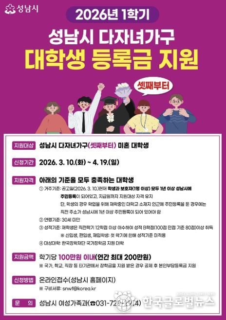 (한국글로벌뉴스 - 박소연 기자) 성남시는 다자녀가구의 경제적 부담을 덜기 위해 셋째 이상 대학생에게 학기당 최대 100만원(연 200만원)의 등록금을 지원한다고 12일 밝혔다.