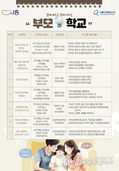 (한국글로벌뉴스 - 박소연 기자) 시흥시는 이달부터 오는 6월까지 관내 학부모 및 예비 학부모를 대상으로 부모 역량 강화를 위한 ‘찾아가는 부모학교’를 총 7개 과정, 20회에 걸쳐 운영한다.