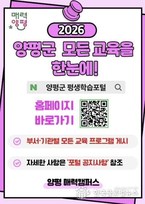 (한국글로벌뉴스 - 박소연 기자) 양평군은 2026년 새롭게 개편한 ‘양평군 평생학습 포털’에 관내 평생학습을 희망하는 군민들이 모든 교육 프로그램을 한눈에 확인할 수 있도록 부서별·기관별로 분산돼 있던 교육 프로그램을 통합해 게시했다고 밝혔다.