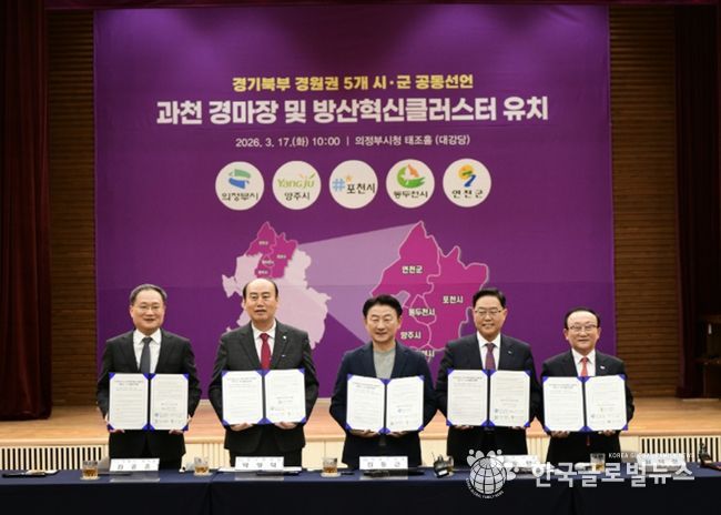 (한국글로벌뉴스 - 박종욱 기자) 포천시는 17일 의정부시청 태조홀에서 경기북부 경원권 5개 시군(포천·의정부·양주·동두천·연천)과 함께 ‘과천경마공원 이전 및 방산혁신클러스터 유치’를 위한 공동선언식을 개최했다.