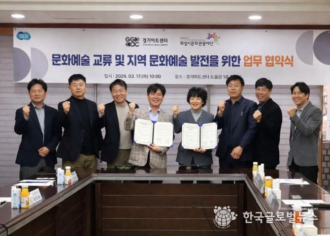(한국글로벌뉴스 - 박소연 기자) 화성시문화관광재단은 3월 17일 경기아트센터에서 경기 아트센터와 문화예술 교류 및 협력 강화를 위한 업무협약(MOU)을 체결했다. 이번 협약은 양 기관이 문화예술 분야에서 상호 협력을 강화하고 지역 문화예술 발전과 시민들의 문화 향유 기회 확대를 위해 추진됐다. 양 기관은 상호 협력을 바탕으로 공연과 문화예술 프로그램을 공동 기획하고 다양한 문화예술 콘텐츠 교류를 통해 지역 문화예술 활성화를 도모할 계획이다.