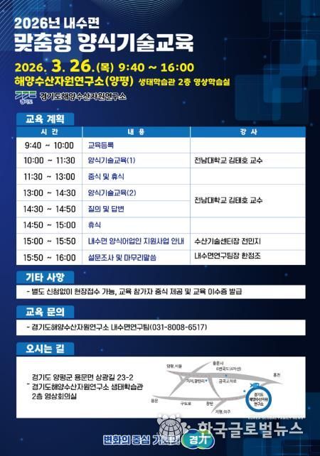 (한국글로벌뉴스 - 박소연 기자) 경기도해양자원연구소는 오는 26일 양평에 있는 연구소 생태학습관에서 내수면 양식 어업인의 역량 강화를 위한 양식기술교육을 실시한다.