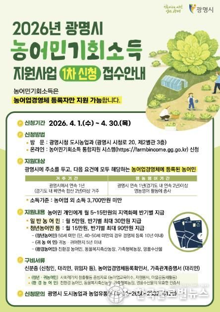 (한국글로벌뉴스 - 박소연 기자) 광명시는 오는 4월 1일부터 4월 30일까지 ‘농어민 기회소득 지원사업 1차’ 신청을 받는다.