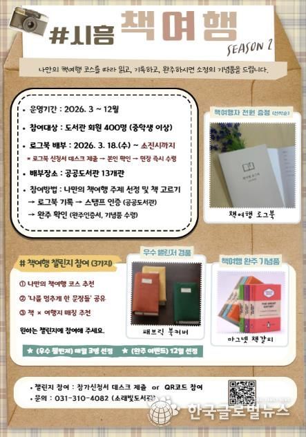 (한국글로벌뉴스 - 박소연 기자) 시흥시도서관은 시민의 독서 실천을 지원하고 일상 속 독서문화를 확산하기 위해 3월 18일부터 ‘2026 시흥 책여행(시즌2)’ 로그북을 배부하고, ‘책여행 로그북 챌린지’를 함께 운영한다.