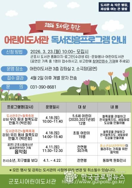 (한국글로벌뉴스 - 박소연 기자) 군포시 어린이도서관은 4월 도서관주간을 맞아 어린이와 가족이 함께 즐길 수 있는 다양한 독서문화 프로그램을 운영한다고 밝혔다.