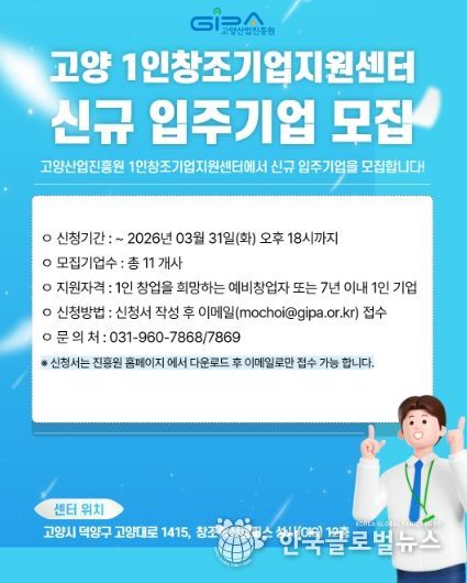 (한국글로벌뉴스 - 박종욱 기자) 고양산업진흥원이 ‘고양 1인 창조기업 지원센터’ 2026년 1차 신규 입주기업을 모집한다.