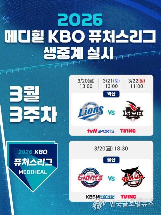 (한국글로벌뉴스 - 박지형 기자) KBO는 3월 20일(금) 개막하는 2026 메디힐 KBO 퓨처스리그 경기를 TV 채널 tvN SPORTS, KBSN SPORTS와 OTT 플랫폼 TVING을 통해 생중계 한다.