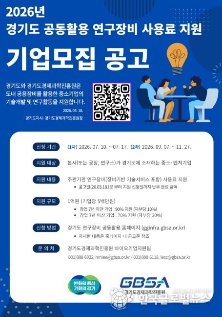 (한국글로벌뉴스 - 박소연 기자) 경기도와 경기도경제과학진흥원이 도내 중소·벤처기업의 연구개발(R&D) 경쟁력 강화를 위해 ‘2026년 경기도 공동활용 연구장비 사용료 지원 사업’을 추진한다.