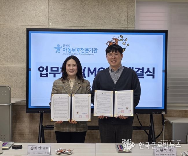 (한국글로벌뉴스 - 박소연 기자) 안성시아동보호전문기관과 제인팜은 지난 17일, 학대피해아동 가정의 심리·정서적 회복 지원을 위한 업무협약을 체결했다고 밝혔다.