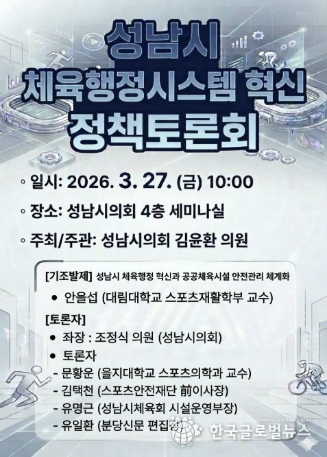 (한국글로벌뉴스 - 박소연 기자) 성남시의회 김윤환 의원(문화복지체육위원회)은 오는 27일, 성남시 체육행정의 혁신 방향을 모색하기 위한 '성남시 체육행정시스템 혁신 정책토론회'를 개최한다고 밝혔다.