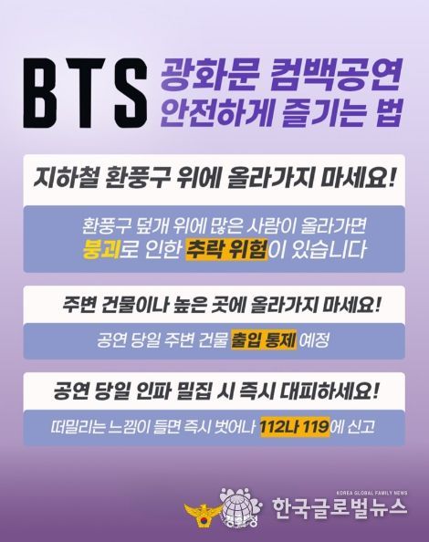 (한국글로벌뉴스 - 박경희 기자) BTS 광화문 컴백공연 안전하게 즐기는 법