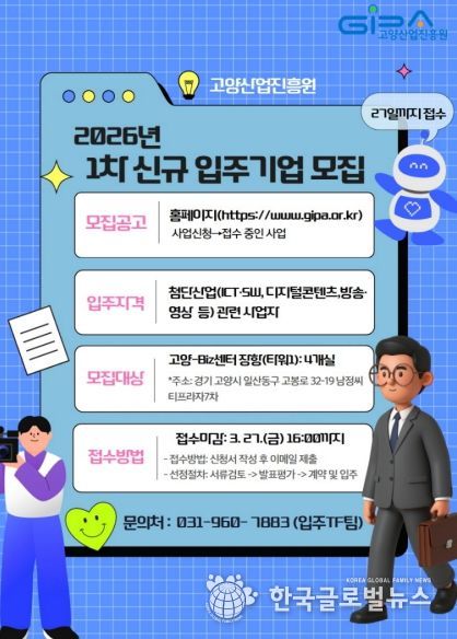 (한국글로벌뉴스 - 박종욱 기자) 고양산업진흥원이 운영하는 기업시설에 입주할 신규 기업을 오는 27일까지 모집한다.