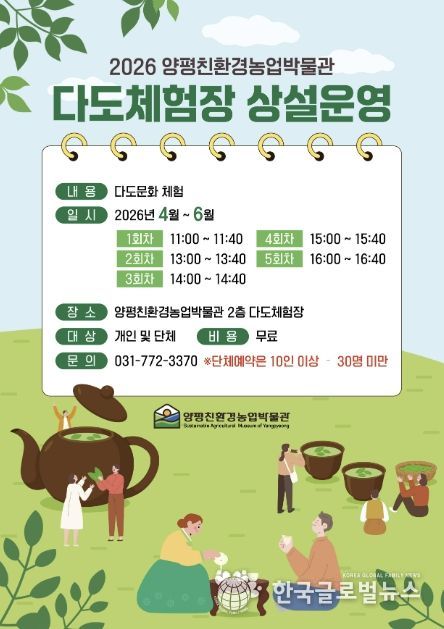 (한국글로벌뉴스 - 박소연 기자) 양평친환경농업박물관은 오는 4월부터 6월까지 박물관 2층 다도체험장에서 상반기 다도체험 프로그램을 운영한다고 밝혔다.