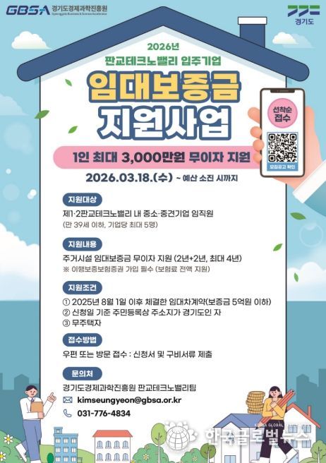 ‘2026년 판교테크노밸리 입주기업 임대보증금 지원사업’은 제1·2판교테크노밸리 입주 중소·중견기업 재직자를 대상으로 최대 3천만 원의 임대보증금을 최장 4년간 무이자로 지원한다.
