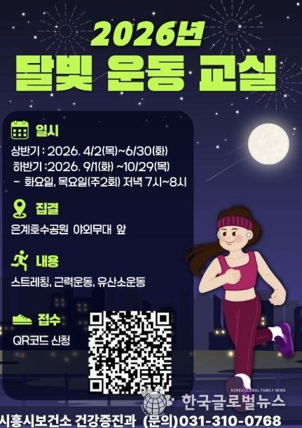 (한국글로벌뉴스 - 박소연 기자) 시흥시는 시민들의 건강한 생활습관 형성과 신체활동 증진을 위해 오는 4월 2일부터 은계호수공원 야외무대 앞에서 ‘2026년 달빛 운동 교실’을 운영한다.