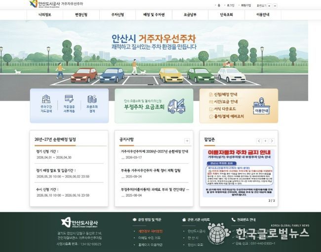 (한국글로벌뉴스 - 박소연 기자) 안산도시공사는 거주자우선주차장 운영 서비스를 전면 개편하고, 내달 1일부터 한 달간 ‘2026년 순환배정’ 신청을 접수한다고 24일 밝혔다.