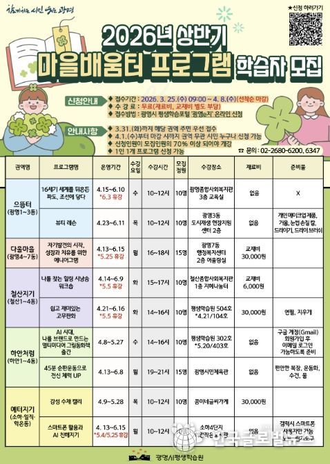(한국글로벌뉴스 - 박소연 기자) 광명시가 시민들이 생활권 내에서 평생학습을 누릴 수 있도록 ‘2026년 상반기 권역별 마을배움터 프로그램’ 수강생을 오는 4월 8일까지 모집한다.