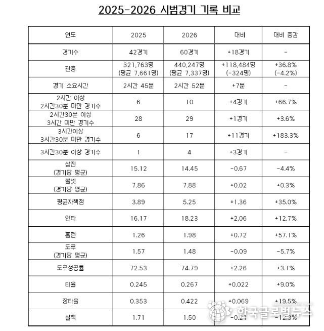 (한국글로벌뉴스 - 박지형 기자) 3월 24일(화) 막을 내린 2026 KBO 시범경기는 60경기에 총 44만 247명의 관중이 입장해 역대 시범경기 단일시즌 최다 관중 기록을 경신했다. 종전 기록은 2025년에 기록한 32만 1,763명이었다.