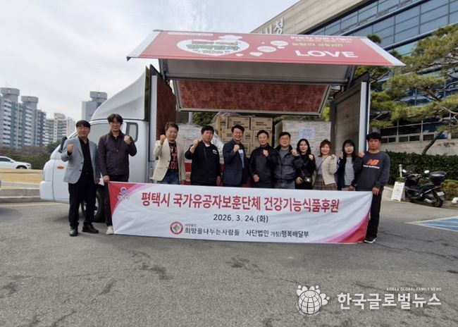 (한국글로벌뉴스 - 박소연 기자) (사)희망을 나누는 사람들, (사)행복배달부는 지난 3월 24일 평택시 보훈단체협의회에 홍삼 건강기능식품 600개를 전달했다.