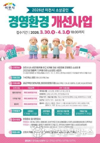 (한국글로벌뉴스 - 박종욱 기자) 이천시는 관내 소상공인의 경영환경 개선과 경쟁력 강화를 위한 ‘2026 소상공인 경영환경개선사업’ 신청 접수를 시작한다고 밝혔다.