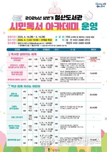 (한국글로벌뉴스 - 박소연 기자) 광명시 철산도서관은 오는 4월 1일부터 ‘2026년 상반기 시민독서 아카데미’ 수강생을 모집한다.
