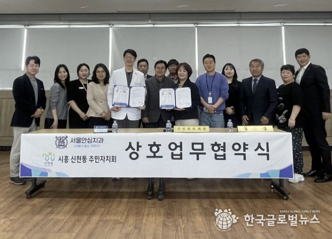 (한국글로벌뉴스 - 박소연 기자) 시흥시 신천동 주민자치회는 지난 3월 25일 신천동 행정복지센터에서 서울안심치과와 신천동 주민의 건강 증진과 의료복지 향상을 위한 업무협약을 체결했다.