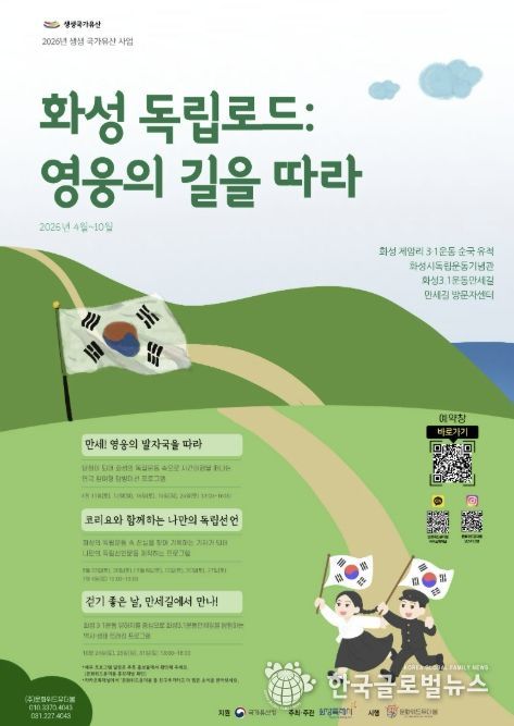 (한국글로벌뉴스 - 박소연 기자) 화성특례시가 오는 4월부터 10월까지 화성 제암리 3·1운동 순국 유적지와 화성 3·1운동 만세길 일대에서 ‘2026 우리고장 국가유산 활용사업(생생문화재)’ 체험 프로그램 3개를 운영한다고 밝혔다. 생생문화재는 지역 문화유산을 이용해 문화적 가치를 새롭게 해석하고, 시민들이 이를 직접 향유할 수 있도록 구성한 체험형 프로그램이다.