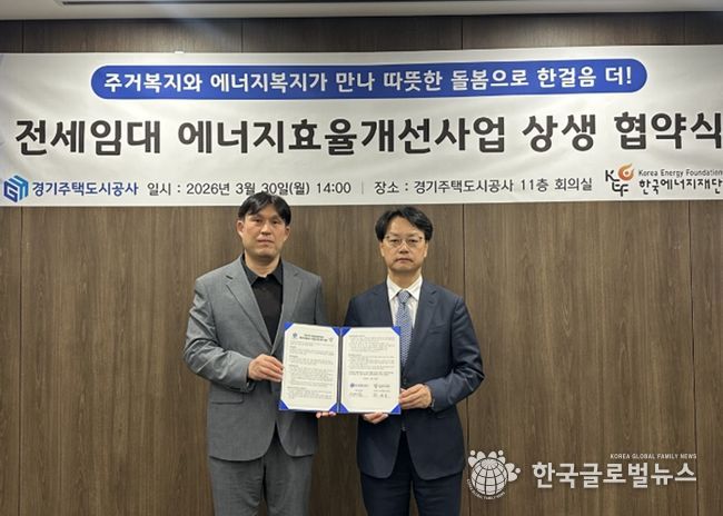 (한국글로벌뉴스 - 박소연 기자) 경기주택도시공사(GH)가 수원 GH 본사에서 저소득층 주거환경 개선과 에너지 빈곤층 해소를 위해 한국에너지재단과 ‘전세임대 에너지효율 개선사업 상생 협약’을 체결했다고 30일 밝혔다.