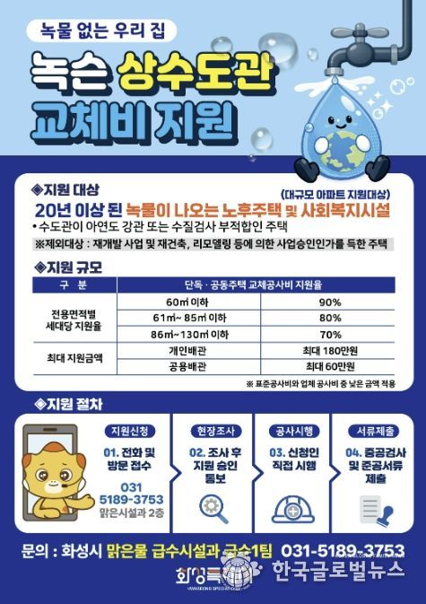 (한국글로벌뉴스 - 박소연 기자) 화성특례시는 쾌적한 주거환경 조성과 안전한 식수 환경 개선을 위해 ‘2026년 녹물 없는 우리집 수도관 개량 지원사업’을 추진한다.