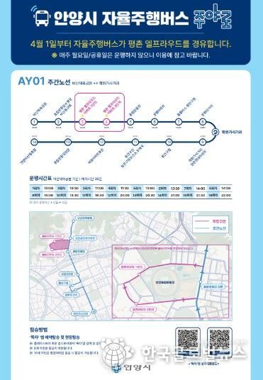 현재 무상으로 운영되는 '주야로'는 경기도 통합교통플랫폼 '똑타' 앱으로 사전 예약하거나, 정류장에서 별도의 예약 없이 바로 탑승할 수 있다. 포털 사이트 지도나 버스 정보 앱에서 노선 번호 'AY01'을 검색하면 실시간 버스 위치도 확인 가능하다.