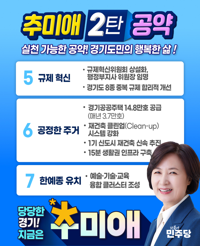 이에 추미애 후보는 “추미애 공약은 도민의 눈높이에 맞춰 실천 가능한 공약으로 마련했다. 1420만 경기도민의 행복한 삶을 책임지겠다.”고 약속드린다.