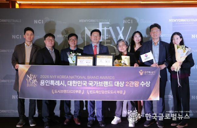 (한국글로벌뉴스 - 박소연 기자) 용인특례시가 칸 국제광고제, 클리오광고제와 함께 세계 3대 광고제로 꼽히는 뉴욕페스티벌(NYF)이 주관하는 ‘2026 뉴욕페스티벌 대한민국-국가브랜드 대상’(NYF K-NBA)에서 도시브랜드(CI) 부문과 반도체산업 선도 도시 부문 1위로 선정됐다.