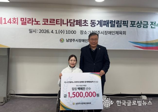 (한국글로벌뉴스 - 박지형 기자) 남양주시는 지난 1일 남양주시장애인체육회가 제14회 밀라노-코르티나담페초 동계패럴림픽 휠체어컬링 믹스더블 종목 은메달리스트 백혜진 선수에게 포상금을 전달하고 성과를 격려했다고 2일 밝혔다.
