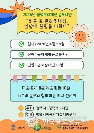 ‘퇴근 후 문화 충전, 일상에 힐링을 더하다’는 2026년 평택복지재단 우수 프로그램 공모사업에 선정된 사업으로, 평택시와 평택복지재단의 지원을 바탕으로 추진되는 지역사회 기반 복지사업이다. 지난 6일 오리엔테이션 및 약정식 체결을 시작으로 본격적인 운영이 시작된다.