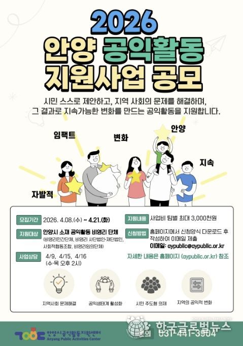 (한국글로벌뉴스 - 박소연 기자) 안양시공익활동지원센터는 지역의 문제를 창의적으로 해결하고 실질적인 사회적 변화를 만들어 갈 비영리단체 및 시민 모임을 모집한다고 10일 밝혔다. 이번 공모는 시민 주도의 공익 생태계를 구축하기 위해 ‘공익활동 지원사업’과 ‘커뮤니티기반 공익활동 협력사업’의 두 가지 트랙으로 운영된다.