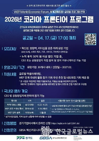 경기도 4차산업혁명센터(C4IR KOREA)는 글로벌 진출 역량을 갖춘 기술 선도 기업을 대상으로 ‘2026년 코리아 프론티어(Korea Frontiers)’ 참가 기업을 오는 17일까지 모집한다고 밝혔다.